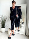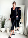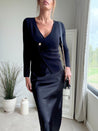 This on trend 2 in 1 dress is the perfect winter staple. Featuring a v neck wrap knitted top with on trend gold button and a built in satin midi slip skirt. This dress is sure to take you from office to drinks in the evening. Pair how model has or with knee high boots for a more casual feel.