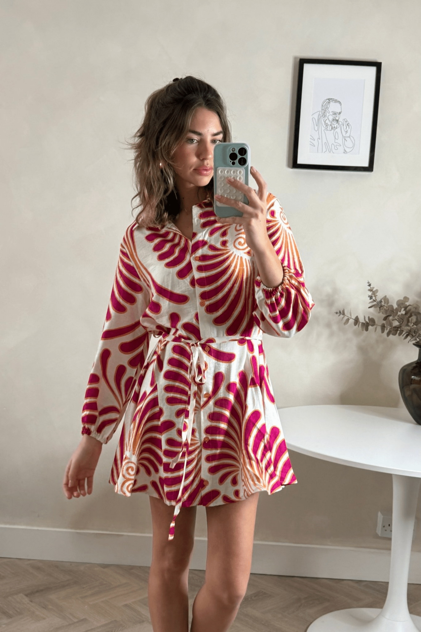 This fun and flirty Myla Mini Tie Shirt Dress is the perfect addition to your wardrobe. Enjoy the vibrant red abstract pattern, cinched with a tie belt for a customized fit. With the button down shirtdress collar and bodet styled skirt, look effortlessly chic.