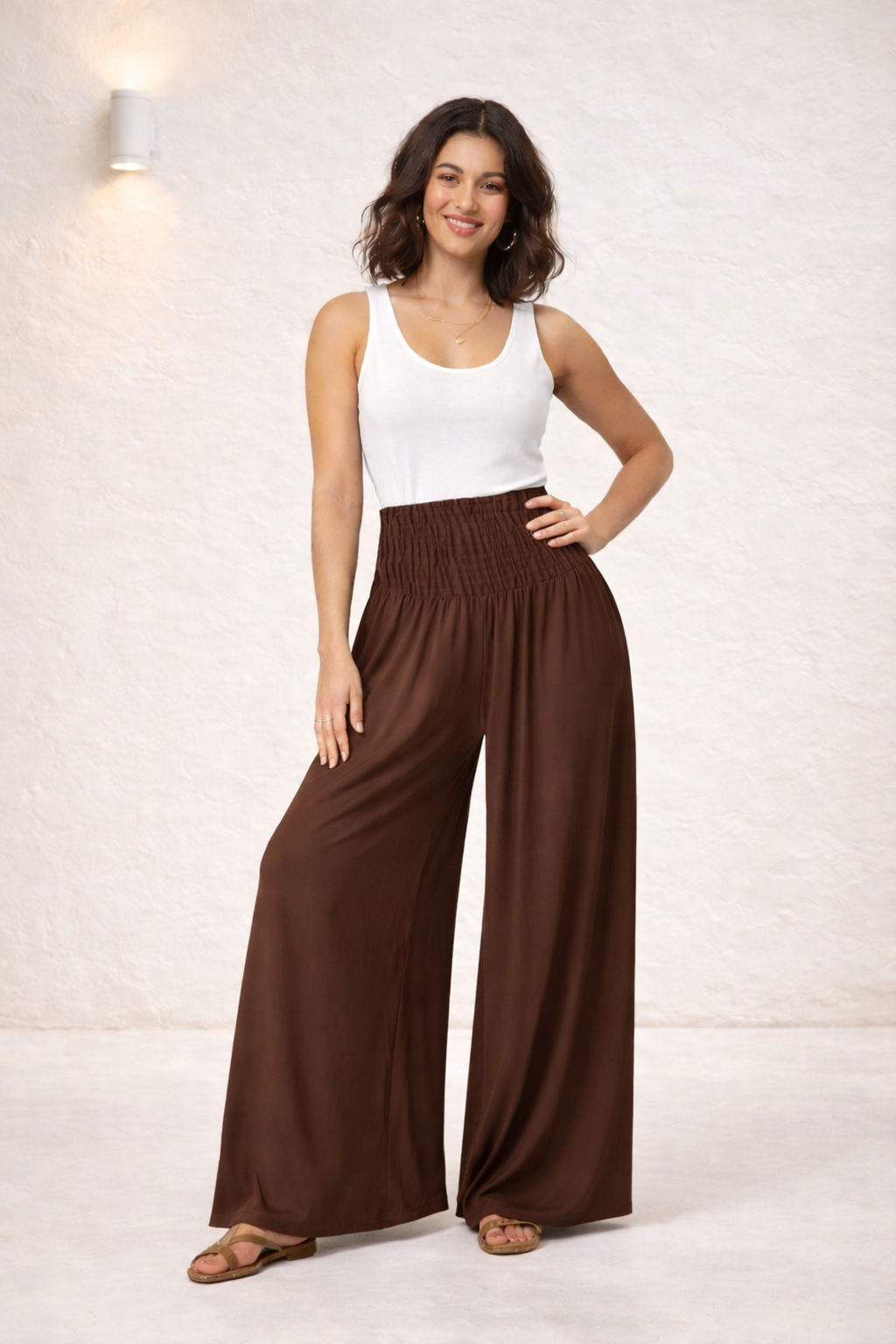 Effortless, flattering and endlessly versatile – our Chocolate Brown Wide Leg Trousers are the ultimate throw-on and go piece. Designed with a high-rise elasticated waistband and fluid wide-leg silhouette, they drape beautifully and move with you for all-day comfort.