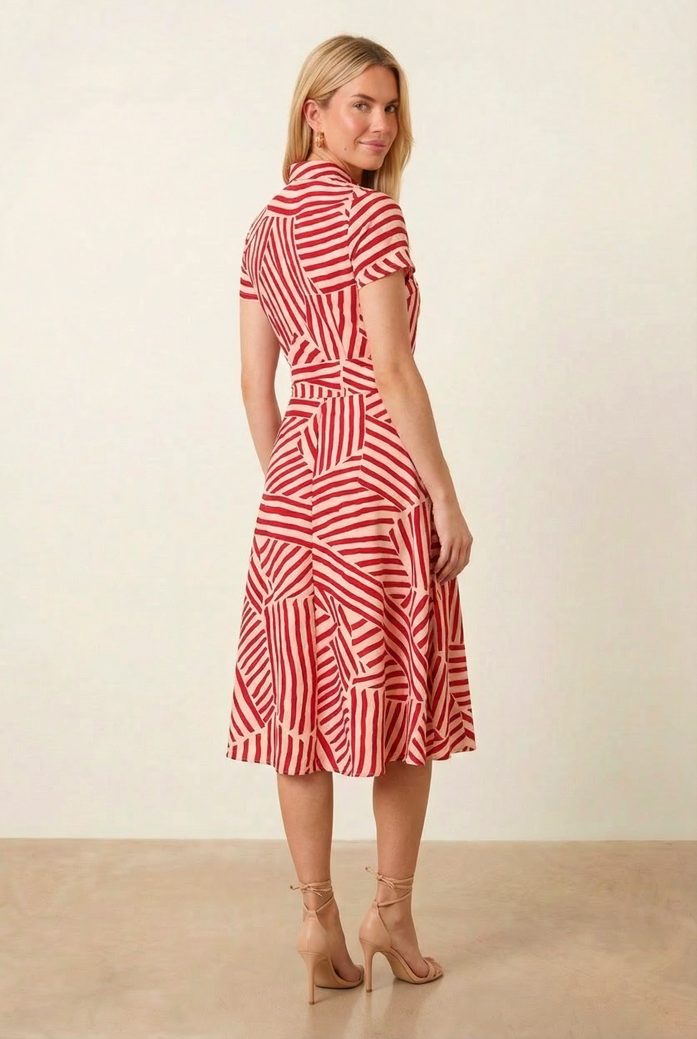 The striking red geometric print adds a modern edge while keeping the look timeless and versatile. Crafted from a lightweight fabric that feels comfortable and breathable, this dress is ideal for work, brunch, holidays or summer events.