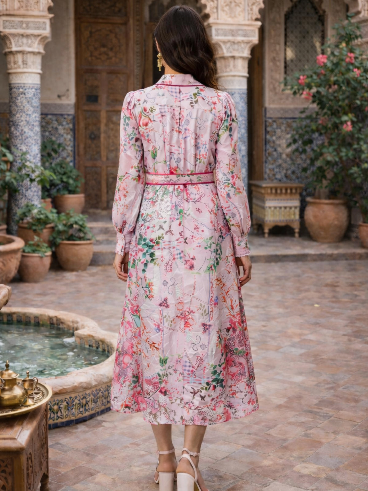 Designed in a soft blush base with delicate floral patchwork print, this shirt-style silhouette features a flattering fitted waist with self-tie belt, full button-through front and subtle contrast piping for that elevated finish. The floaty midi-length skirt moves beautifully with every step, while the long sleeves with gentle cuff detail keep it refined and wearable across seasons.